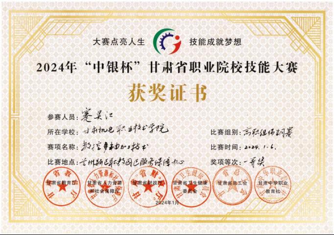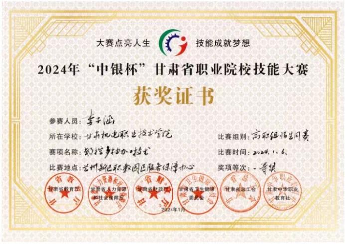 2024年1月5-7日,2024年“中银杯”甘肃省职业院校技能大赛数控多轴加工技术赛项(高职师生同赛)在兰州新区职教园区服务保障中心举行。全省共有17支代表队、34名师生相聚新区,上演技能对抗、巅峰对决。经过激烈角逐,我院工业中心教师蹇昊江,机械工程学院数控技术JX2382班李子涵组成的团队荣获一等奖。