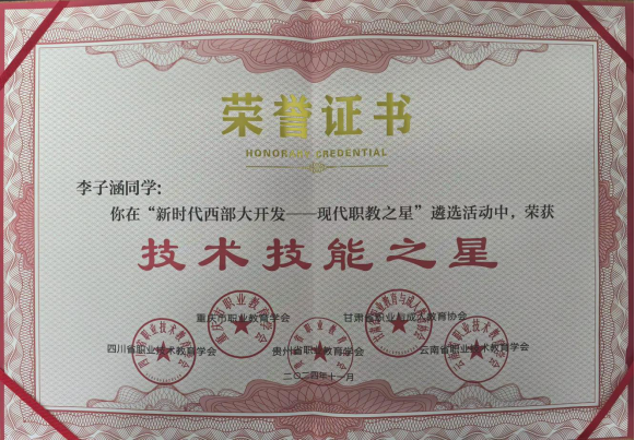 近日,国家级技能大师工作室工匠学徒班的优秀学员李子涵,在“新时代西部大开发 - 现代职教之星” 遴选活动中荣获“技术技能之星”称号。