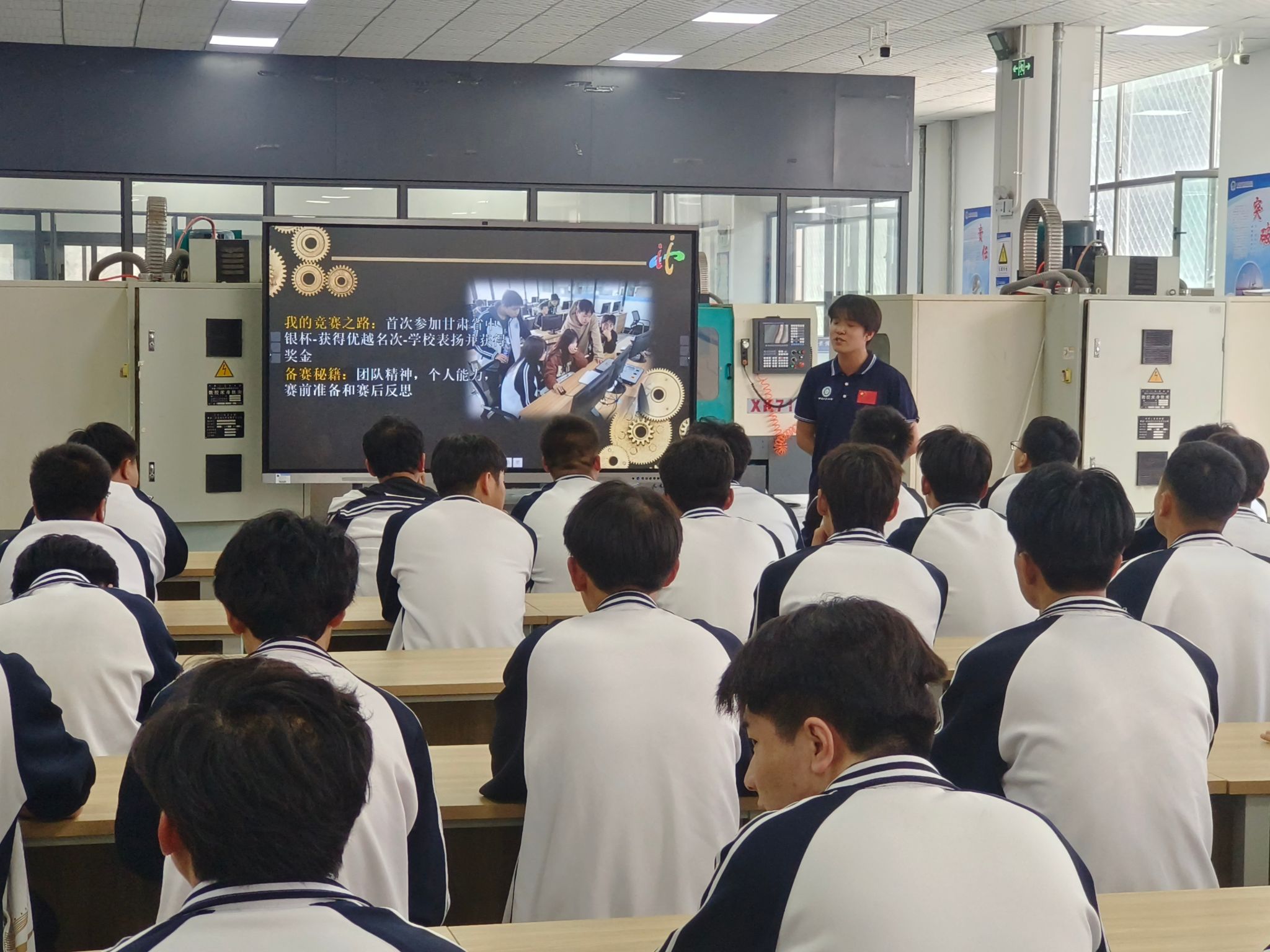 5月14日下午,工业中心在高端数控实训基地举办了技能大赛经验分享会。本次分享会由大赛优秀选手代表蹇昊江老师和李子涵同学(JX2382班)进行分享,机械学院数控专业学生参加了会议。